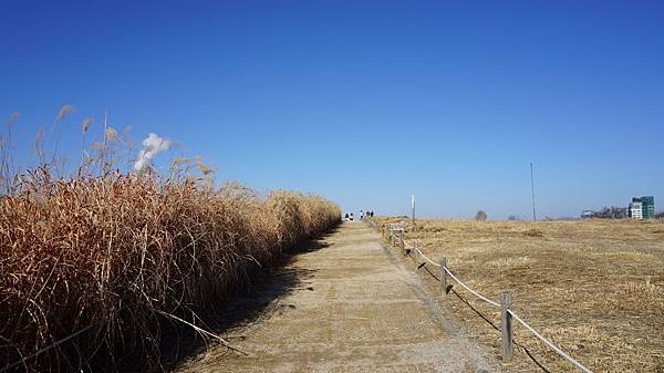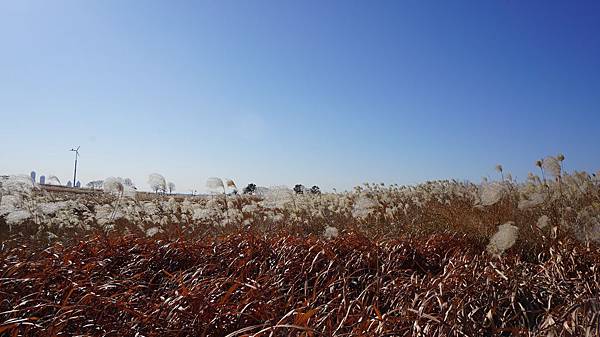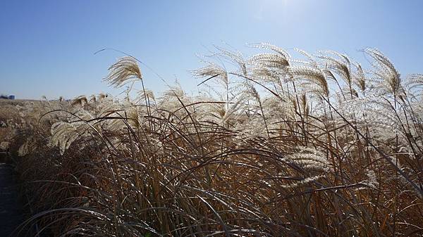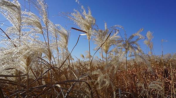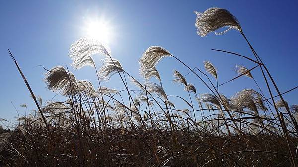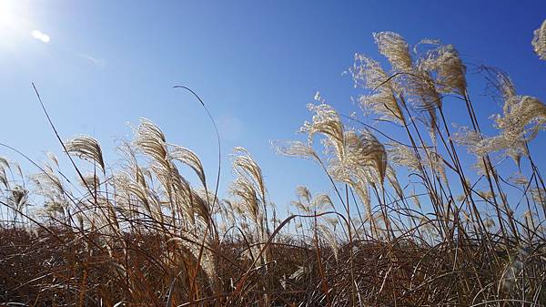偌大的田園旺盛地生長著一畂一畂的紫芒草、蘆葦與白茅,一株株嫩芽隨風彎腰、伸展、搖擺;左搖右擺的模樣成為藍天背景下不安分的插圖,也成了婆婆相機中千嬌百媚的模特。