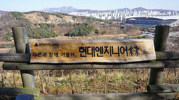 走到第一個路口,先過對面馬路(經過世界盃公園(월드컵공원)的地標牌)然後再橫過大馬路,經 蘭芝川公園到達 天空公園上坡地點。