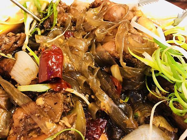雞肉及冬粉是二人份量(辣椒+香蔥+洋蔥是三人份XD);食量不多的兩人用餐的話,點一盤小號燉雞便剛剛好。