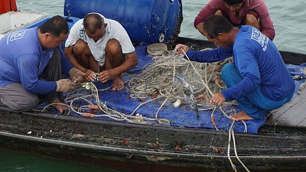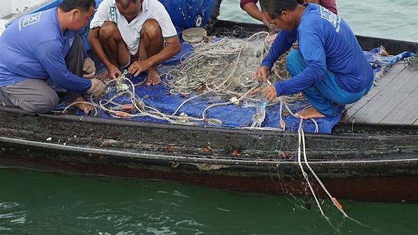 只見漁民把小蟹逐隻敲碎,然後拋回海中……看見我們滿頭問號,船長夫人解釋:如果不敲碎其他魚類是沒辦法吃的~~~