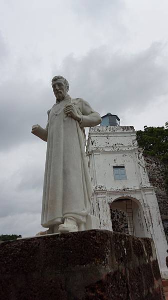 教堂的廢墟前豎立了 聖方濟.沙勿略的斷臂雕像。