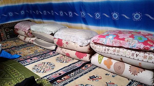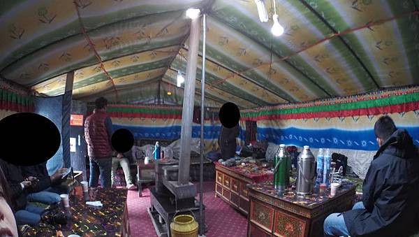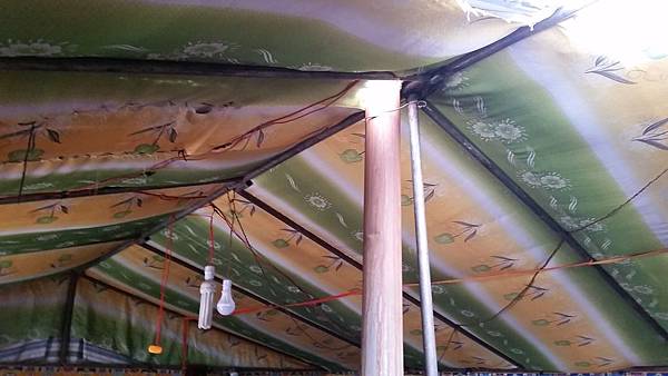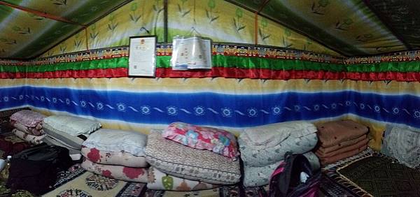 帳篷的內部「牆壁」圖案是多層的顏色間條,天花板是綠黃色的「棉襖被鋪」,地下是幾何圖案的絨毛地氈;狂風被由氂牛毛褐子編制而成篷布抵擋,我們在裡面就像是被保暖被鋪包圍著。