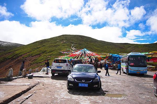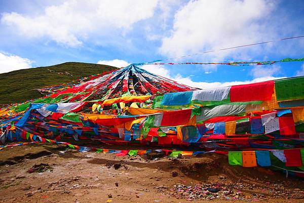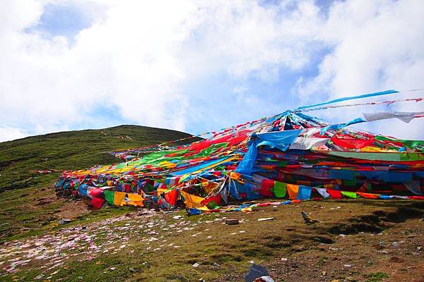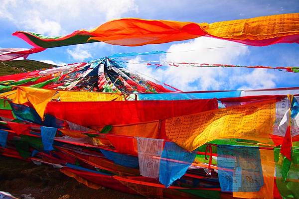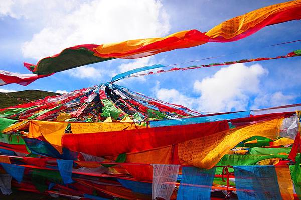 在這座生機勃勃的美麗山口上,掛滿了印有經文紙條及祭山的經幡;七彩顏色的經幡在空中飄灑、亂舞、飛揚,無窮的濃厚色彩沁入心脾,像是要把心臟所有空隙都填滿快樂的繽紛,掃空一切煩惱。