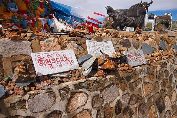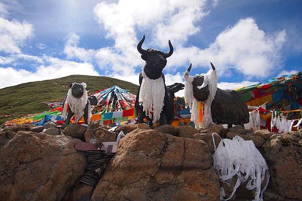 除了漫天經幔,在米拉山口的最高處,矗立着一座被稱為「雪域之舟」的西藏牦牛的石雕像;牦牛身上掛滿哈達,渾然天成的威武神態像是神聖、高尚及尊貴的化身。