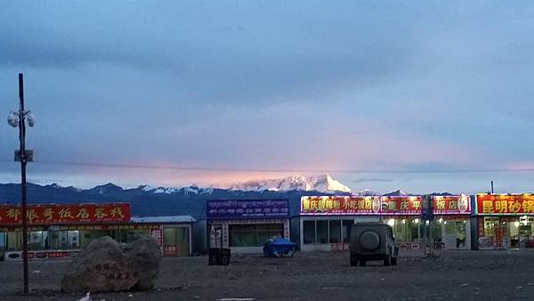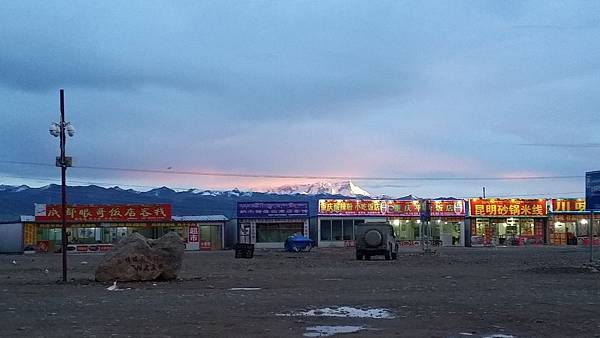原來,是終年積雪的「念青唐古拉山」的主峰,受到落日的餘暉憐惜,整個山峰難得地染上金黃色的光芒。