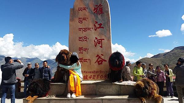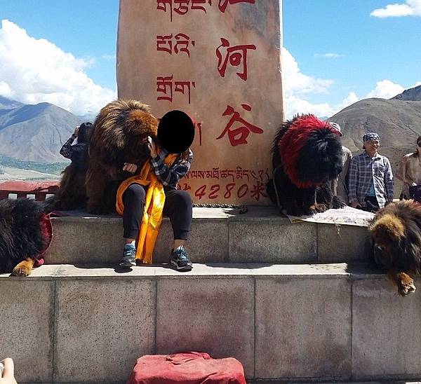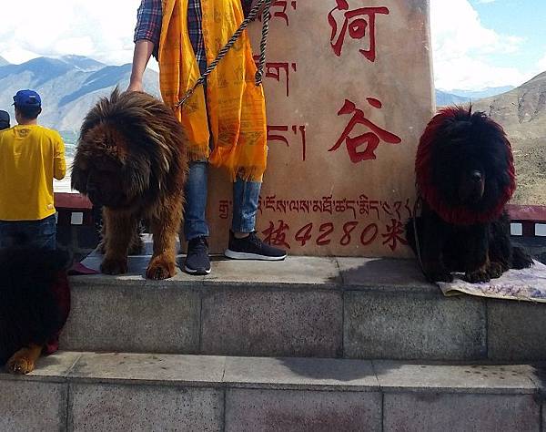 我們走到佇立著最多遊客的盡頭,眼前是被讚譽為「四大天王」、顏色各異的四隻藏獒;要是拍照的話,一人收費20元。