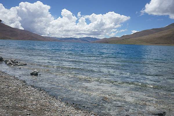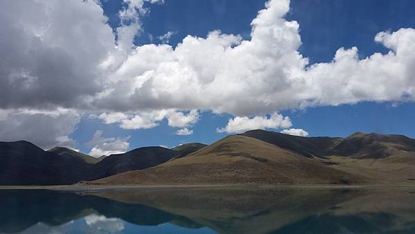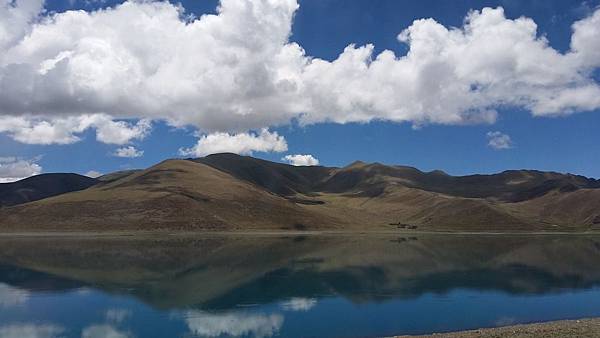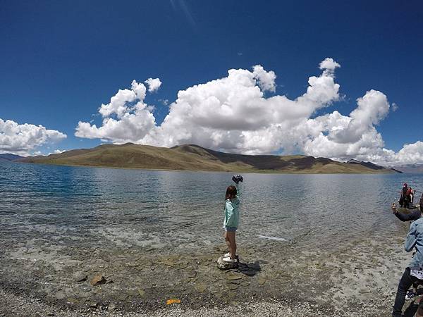眼前的羊卓雍措,就像一塊晶瑩剔透的藍碧玉,碧光璀璨;湖面像匹平滑柔軟的藍綢緞,在我們眼前如宗卷展開,連綿千里;不同於巴松措的青山綠水,平靜無波的湖水像個乖巧溫馴的藍衣姑娘,恬靜的美態溫婉嫻淑。