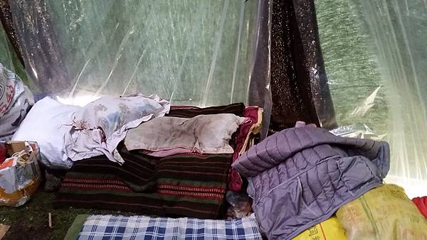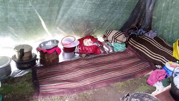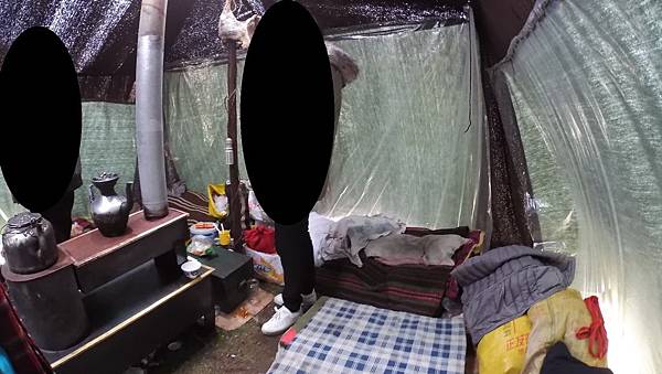 帳篷內由數枝粗幼不一的石柱支撐,簡單卻穩固;「牆上」每邊掛著像尼龍的大掛布,加入抵禦風沙的「軍隊」中。