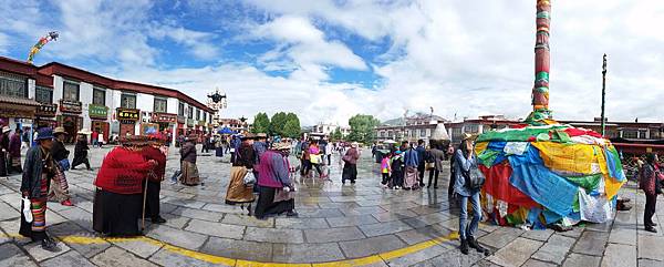 大昭寺前是個有趣的地方,集合了從不同國家來的人、匯聚了不同意義的動作,然而卻體現了藏族的獨特文化;寺前除了有敬拜的信眾、觀光的遊客、不斷招攬生意的民眾(有很多女藏民走來,鍥而不捨地問我們要不要鬢辮/綁頭髮)、還有最獨特可愛的光景—— 就是圍繞著大昭寺轉經和磕長頭的藏民們。