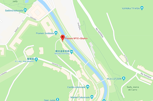 這座坐落於磨坊溫泉長廊盡頭的溫泉名為「岩石溫泉(Pramen №10 «Skalní»/Skalní pramen)」,是卡羅維瓦利的15個噴泉之一;