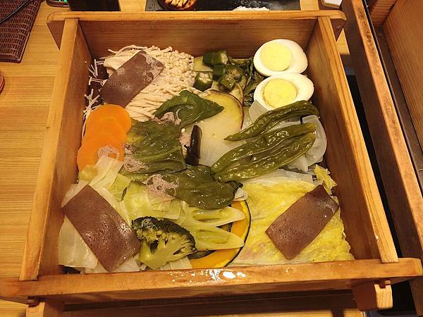 雞蛋、蘿蔔、青椒、小辣椒、西蘭花、杏鮑茹、金菇、香菇、蒟蒻、椰菜、黃芽白、小棠菜、類似通菜的不知名蔬菜、蕃薯片、南瓜片、大蔥等等…